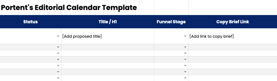 At Portent, we prefer to set up our editorial calendars using a template we created in Google Sheets. However, plenty of other tools could work for you and your team, such as calendar apps, digital whiteboards like Mural, project management tools like Asana or Trello, or designated content calendar software.
