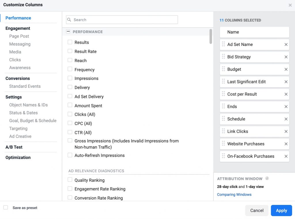 Any metrics you choose to add to your Custom Columns selection can be saved for later use in Ads Manager by selecting Save as Preset.