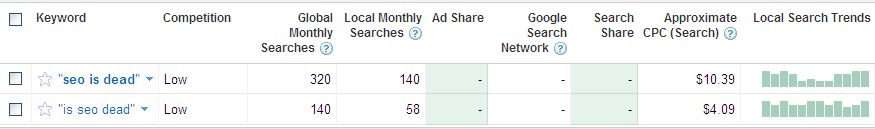 Wow, really? Ten bucks a click for “SEO is dead”? Hmm, I wonder who’s stupid enough – I mean enterprising enough – to bid on such a term: