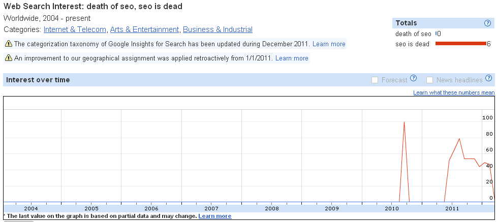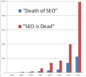 Pretty self-explanatory. If I were a betting man, I’d think it’s a safe wager that SEO will be dying more this year than last year. What’s your bet? Seems to me that SEO has a bright future when it comes to dying!